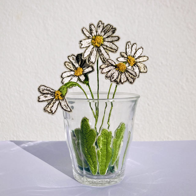 Apportez une touche de printemps à votre intérieur avec ce bouquet de pâquerettes en broderie 3D. Grâce au Stumpwork, les fleurs prennent du relief. Elles se détachent du support pour un rendu graphique et vivant.